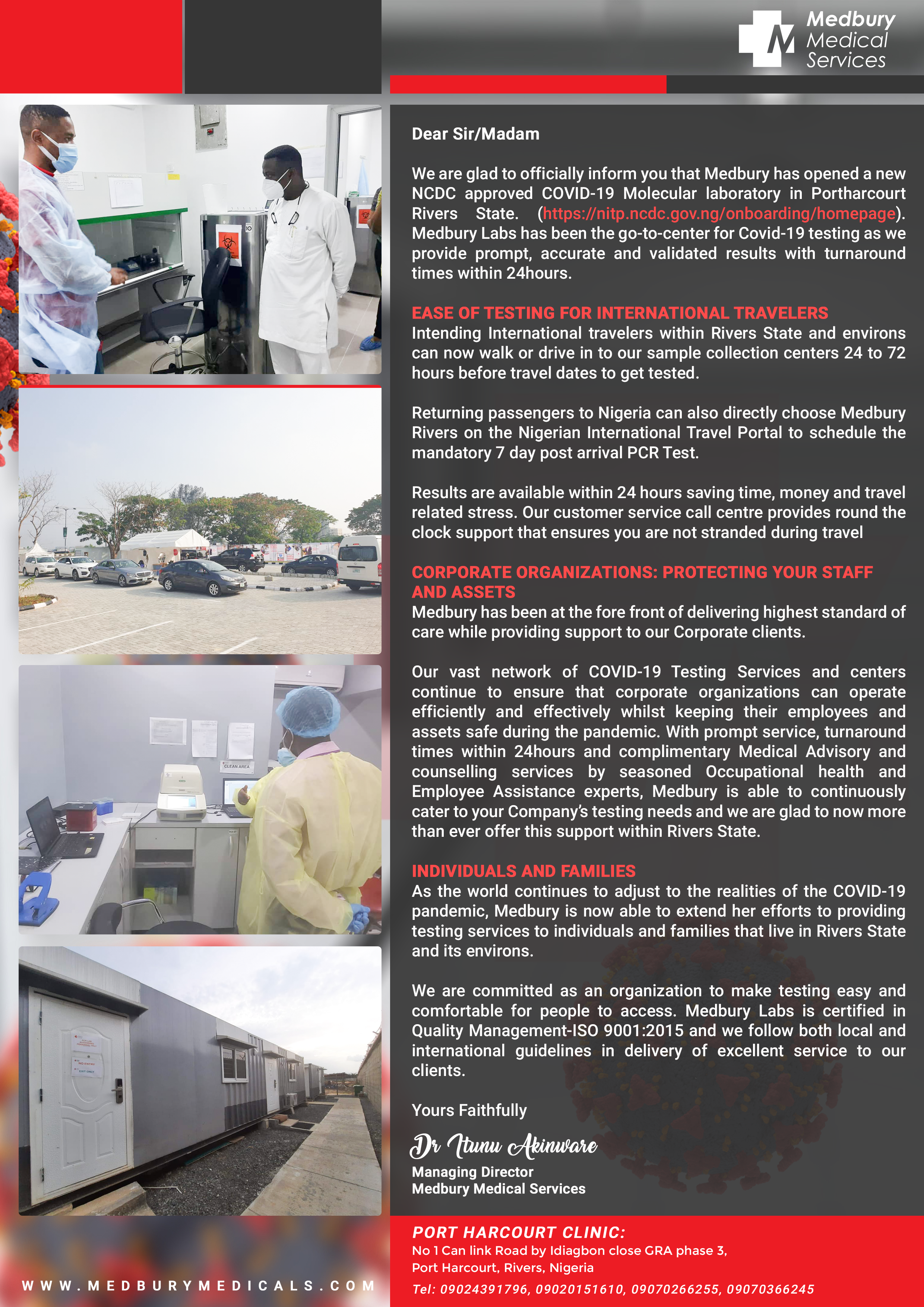 Intending International travelers within Rivers State and environs can now walk or drive into our sample collection centers 24 to 72 hours before travel dates to get tested.